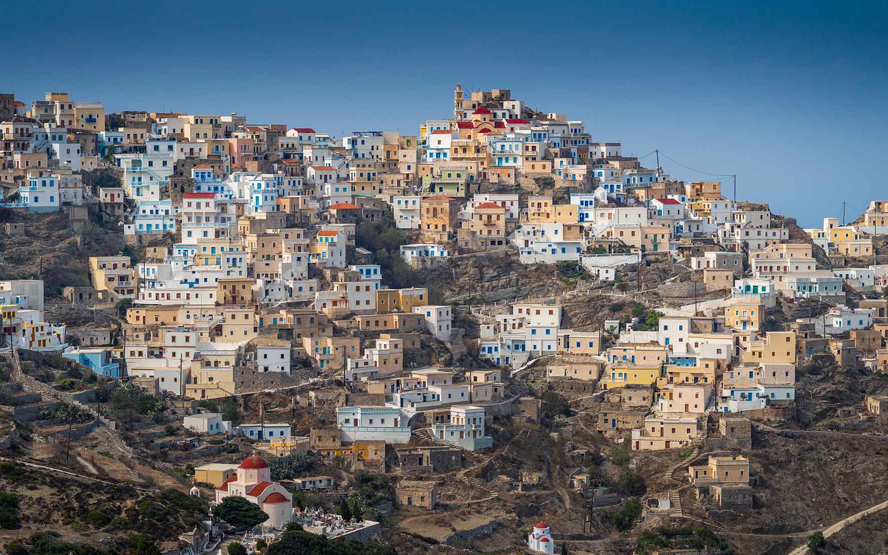 Most of Megalo Chorio (literally: “Big Village”), with its traditional Aegean architecture, was built in the 19th century. Before then, people had lived inside the fortified area of town, constructed by the Knights of St. John, at the top of the hill.