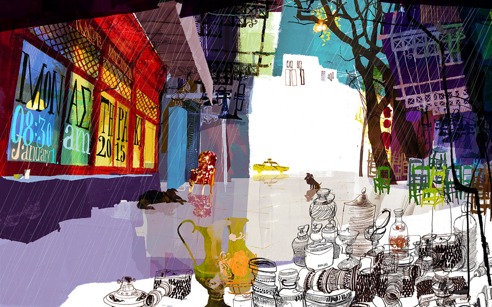 Daniel Egneus made a colorful splash on the Athens art scene last summer with his exhibition of 100 drawings of Athens streets at the Zoumboulakis Gallery, titled ‘As I Walked Out One Morning’.