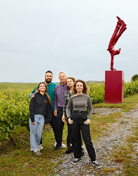 Evangelos Gerovassiliou with his wife, Sonia Tziola-Gerovassiliou and their three children: Vassiliki, who leads marketing; Argyris, a talented oenologist; and Marianthi, who has begun taking on the management of the estate. In the background stands “Balancer”, a sculpture by George Lappas.