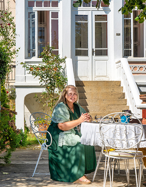 Aliki Michalopoulou, great-granddaughter of Zoulí Christidi, at the family mansion with a hundred rosebushes where she grew up.