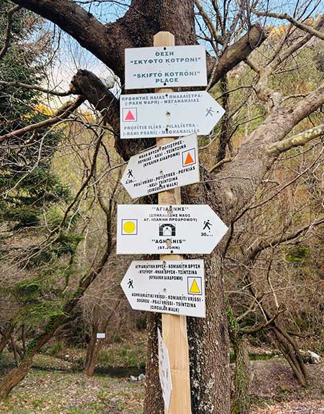 The village square is the starting point for nine hiking routes, most of which lead to churches, caves, or springs. All are mapped and signposted, each with varying levels of difficulty. The “Tsintzina – Aghios Giannis” trail leads to the cave-like church of Saint John the Baptist, a 14th-century chapel built into the rock. The route begins in the village with a gentle incline that becomes steeper as it reaches the chapel. It’s worth taking short breaks to enjoy the beauty of the forest.