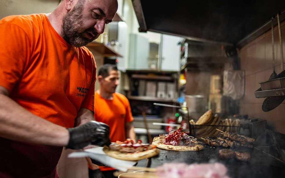 “My father, Tasos, opened the first place when he came back from the war in 1946. It was tiny, just 2.5 square meters all told,” says Kostas. He has a system: He grills the souvlaki, kebabs and beef patties on the spot, places the pitas on the grill too and tops them with the various ingredients as they crisp up. He chops the tomato over the flatbread, while a mixture of freshly chopped onions and parsley goes on top, along with a few fried potatoes and his famous red sauce. The success lies in the grilling. “I fire up the grill in the morning. We are traditional, using charcoal, not gas or electricity,” he says with a note of pride.