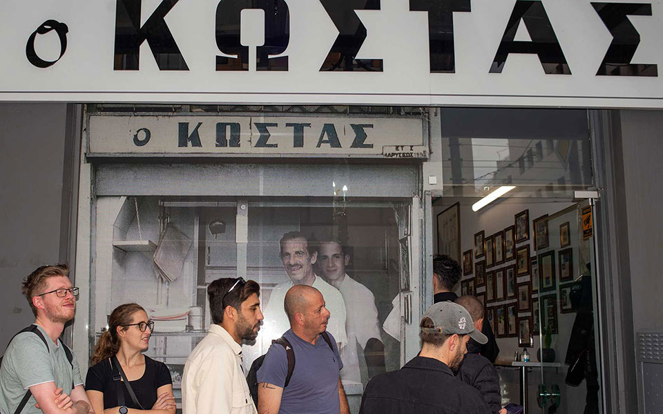 You need to have patience if you want a souvlaki from Kostas. There’s even a sign saying as much: “No stress, the owner is at heart attack age!” The wait may last as long as 40 minutes, during which Kostas, a solo act, mans the grill, prepares the pitas and puts together his iconic souvlaki – in the best mood you can expect from a person effectively working in a furnace. He has three high tables for whoever nabs them first, and everyone else has to sit on the steps outside or eat standing up. He is closed on the weekends and only operates until 5 p.m. on weekdays.