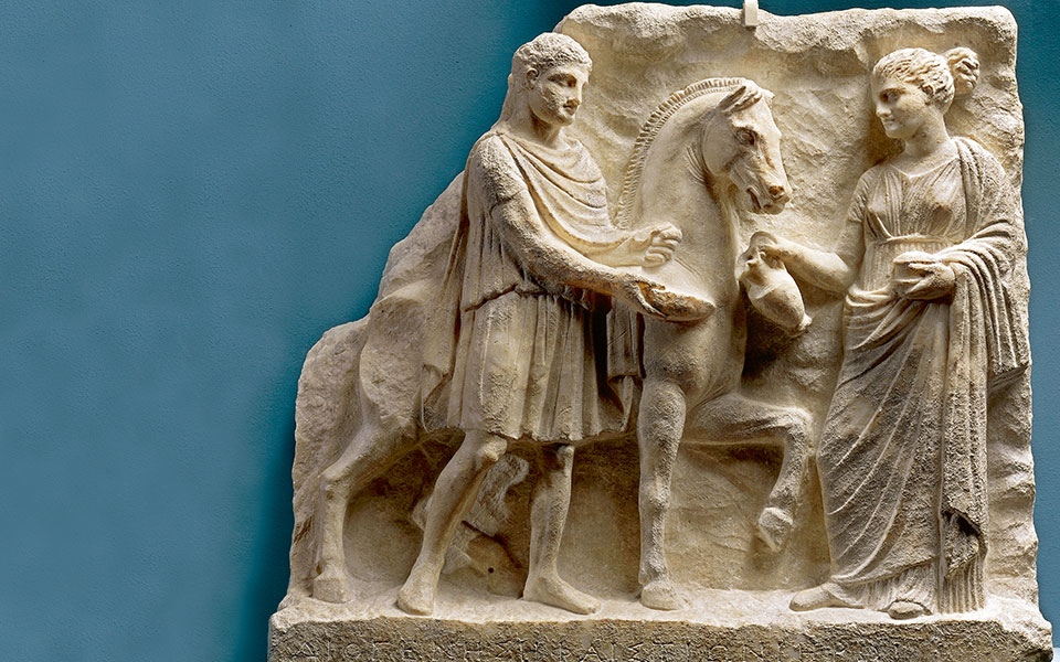 Relief showing the scene of the outdoor libation, 330-315 BC, fragment of a votive stele in marble dedicated to Hephaestion from Pella (Archaeological Museum of Thessaloniki).
