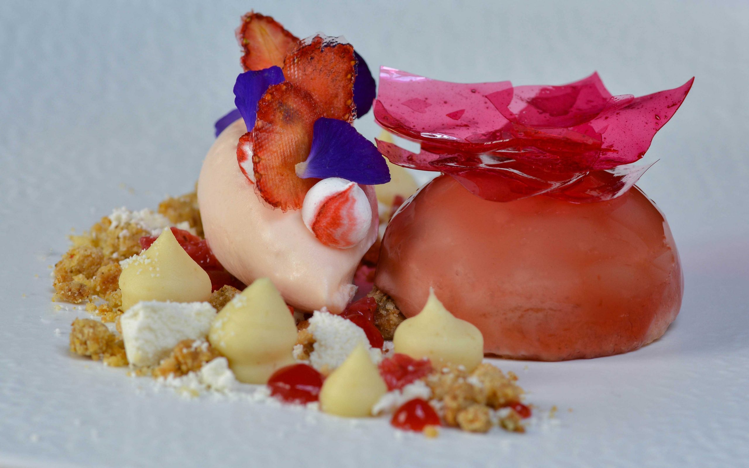 Scottish strawberry bavarois, strawberry icecream/glass, fennel seed crumble and white chocolate namelaka.