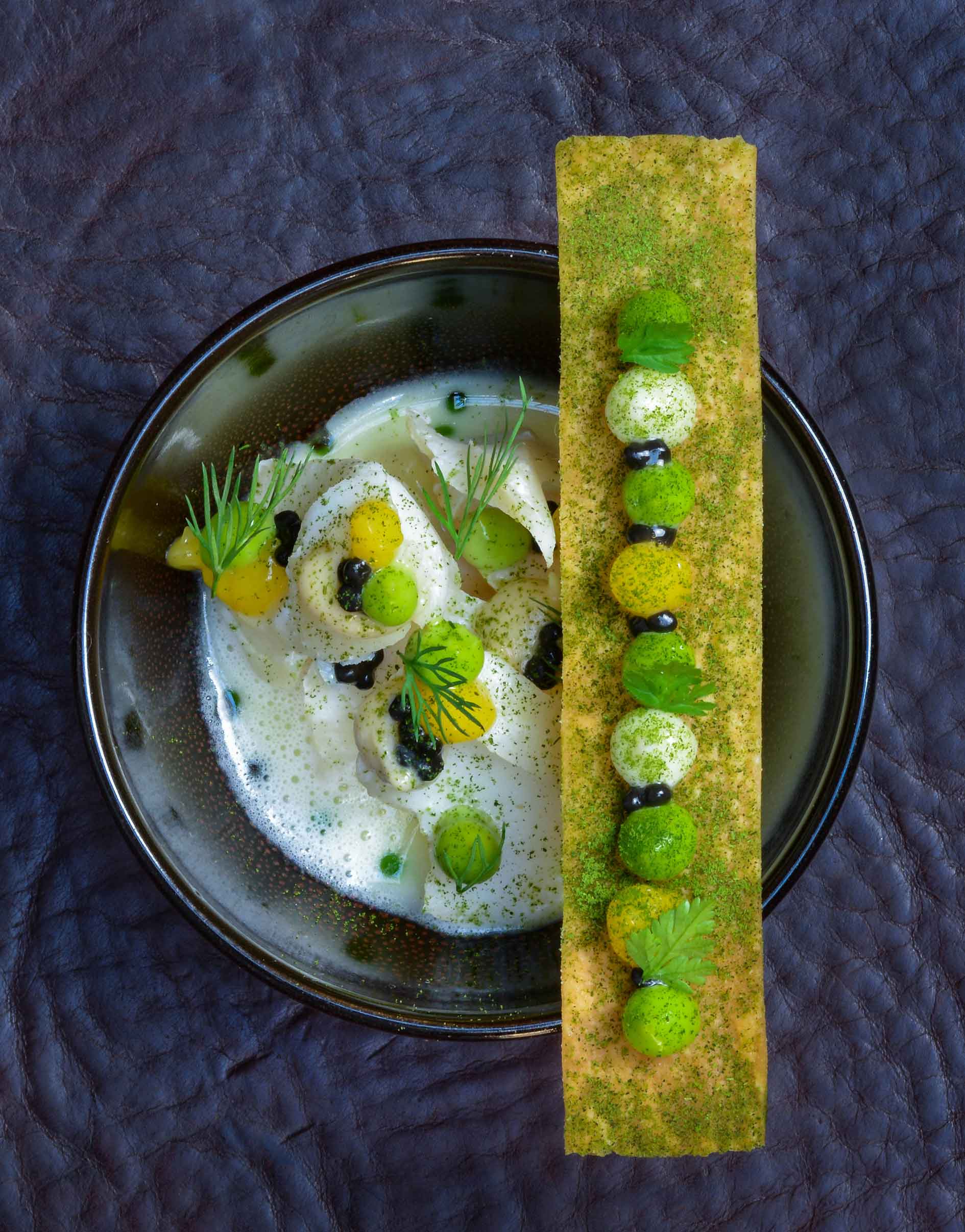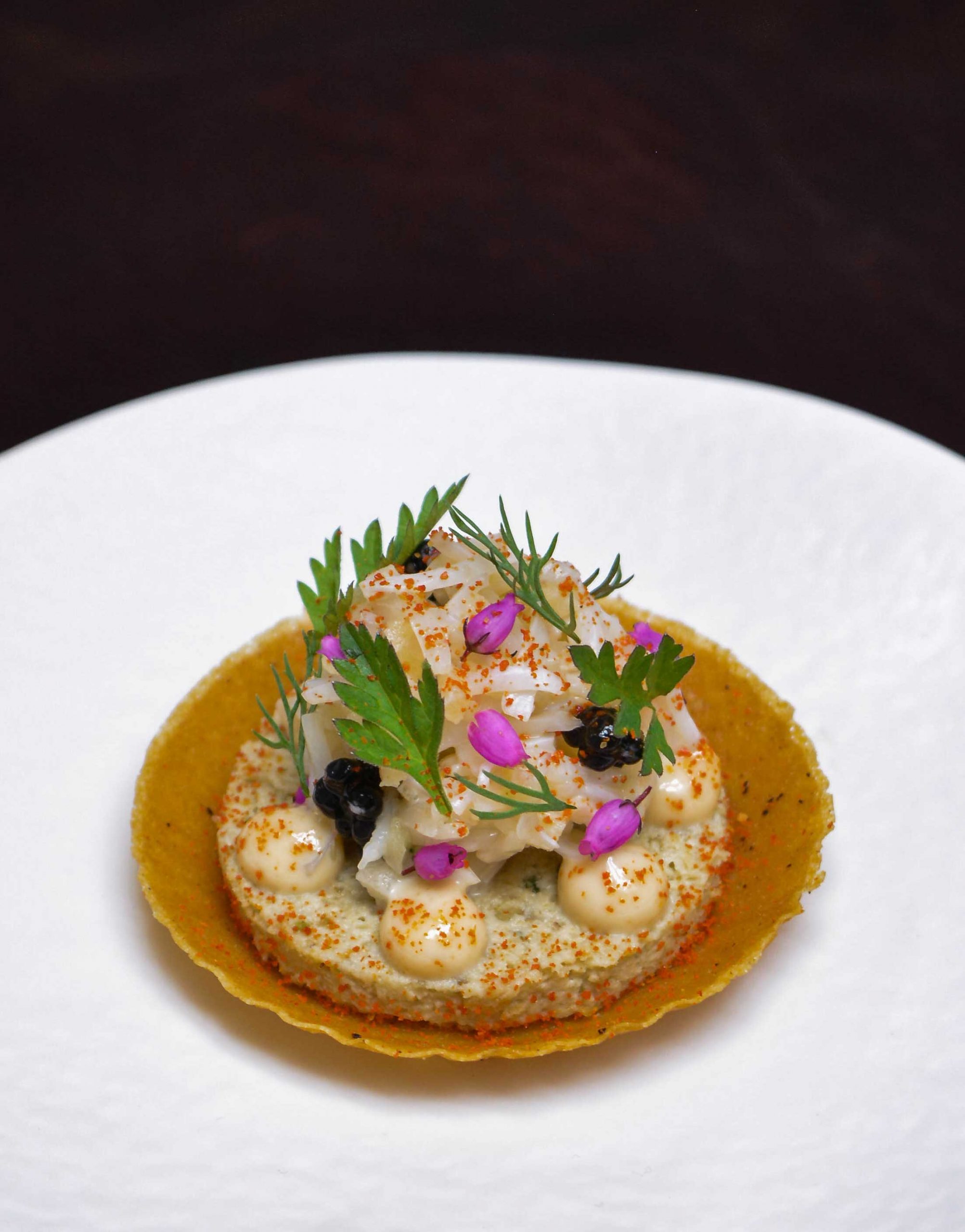 Left: Spiros Katridis. Right: Scottish brown crab, mooli dressed in a chervil and tarragon vinaigrette, caviar and gorse flowers.