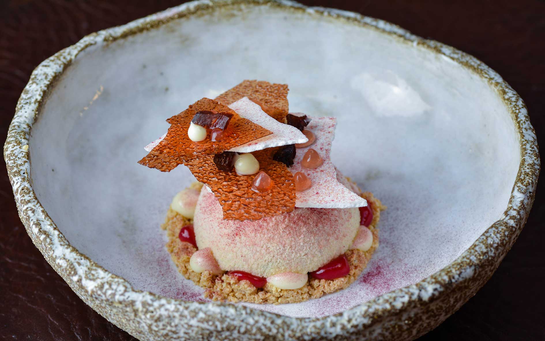 Scottish plum parfait made with plums from our walled garden, sweet and sour semi-dried plums, long pepper crumble, fermented plum meringue and glass.