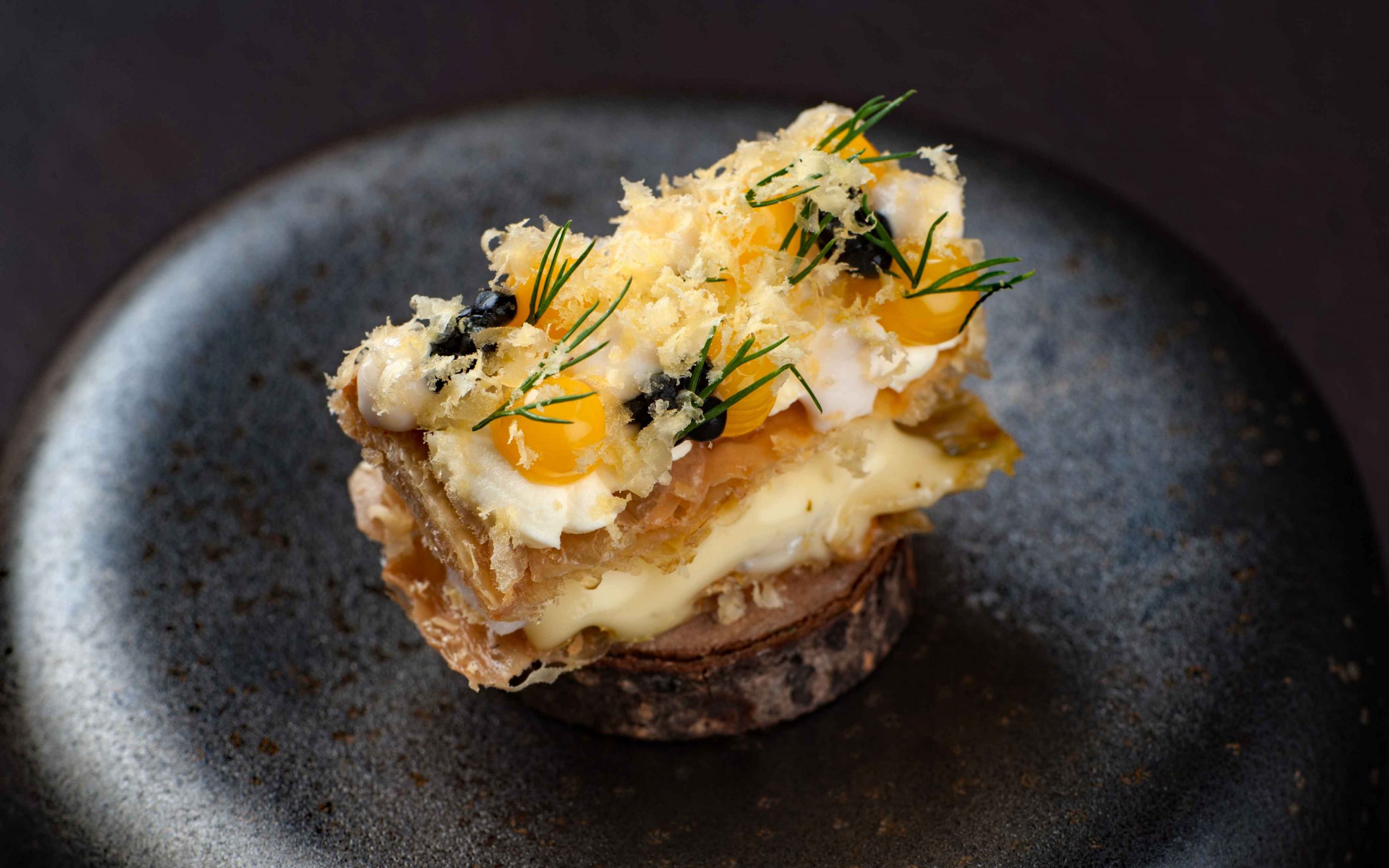 Haddock sandwich: poached haddock, crispy chicken skin, smoked creme fraiche, confit egg yolk and caviar.