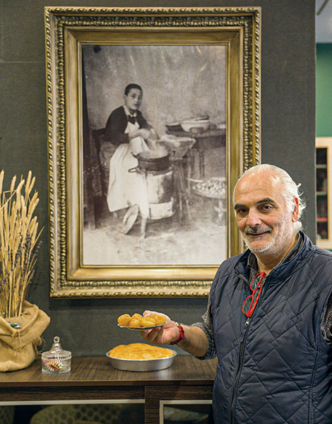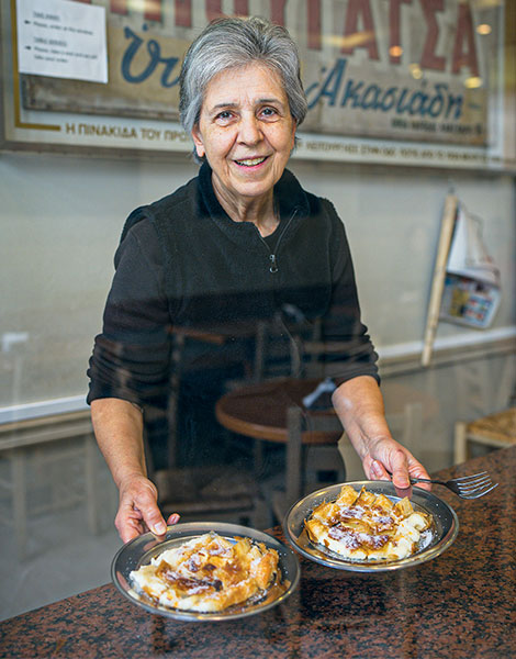 “Airy pastry requires real skill and fast hands, or it’ll stick and become unworkable,” says Mr. Vasilis, one of the most experienced dough masters at Iordanis’ workshop. Mrs. Ioanna, wife of the late fourth-generation pastry maker Iordanis Akasiadis, knows exactly how to work the dough. “We try not to stray from the traditional method,” she says. “It’s harder, but it’s what keeps everyone coming back for that familiar taste.”