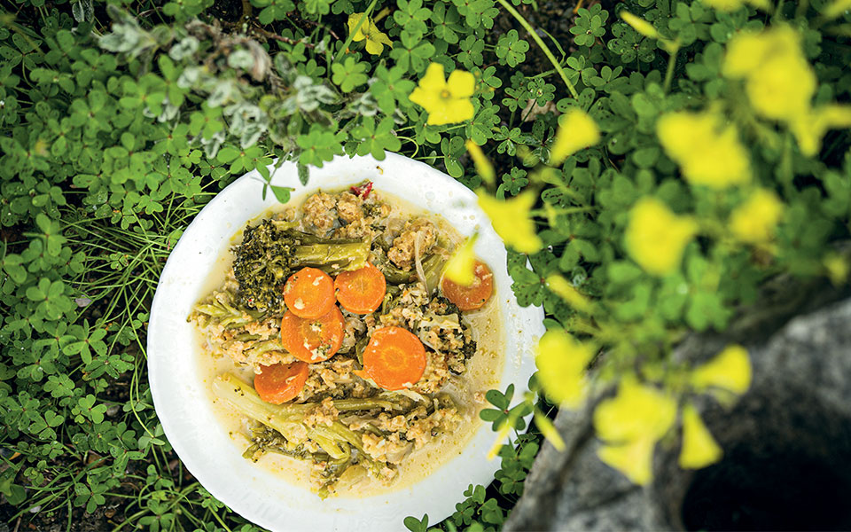 A dish by Ntounias made with whatever the garden yields: sautéed cauliflower and broccoli with cracked wheat, sheep’s milk, and seasonal herbs.
