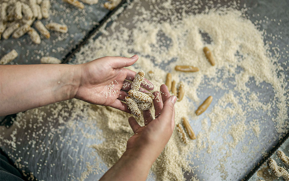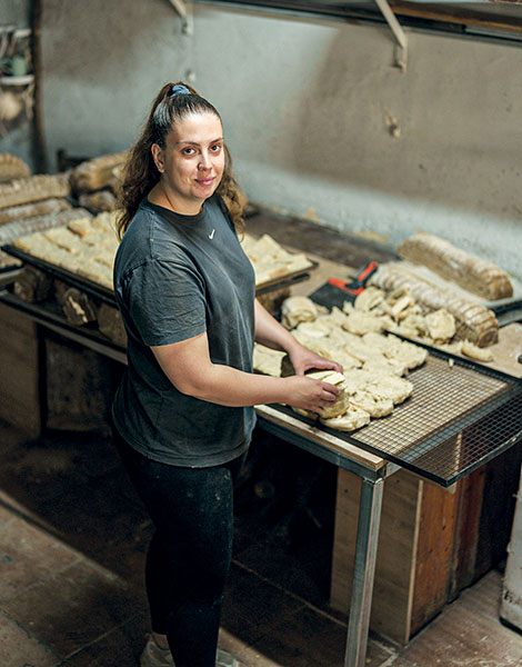 Today, the wood-fired oven remains the heart of the bakery. Fueled by logs, it can bake up to 100 kilos of bread at once. The loaves go in first; when the temperature drops, in go the rusks, cookies, and breadsticks. “The wood oven gives everything its signature aroma and character,” says Maria. The bread is made with their own natural sourdough, and the rusks come in barley, spelt, sesame, carob, and multigrain varieties. The selection is wide, but the core principle is quality: village-style loaves made with wheat, wholegrain, rye, barley, spelt, or 100% carob flour. “We don’t use pre-made mixes, and everything is kneaded by hand,” she says. “But the old-school bakeries are closing. People buy bread at the supermarket and keep it in the fridge to make it last. Ours is alive.”