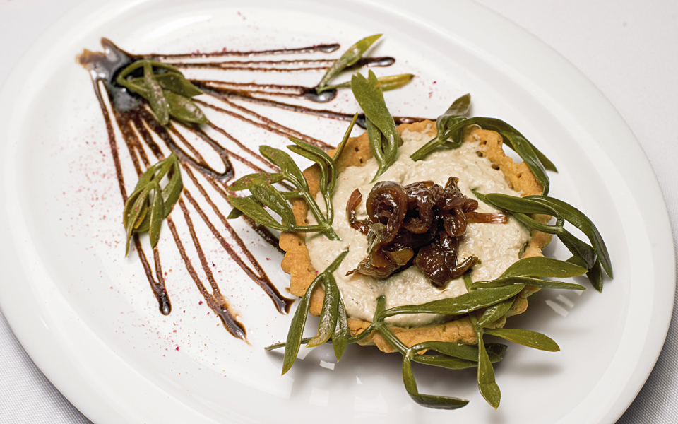 Rosebud's savory tart with caramelised onions and sea samphire, a delectable vegan appetizer.