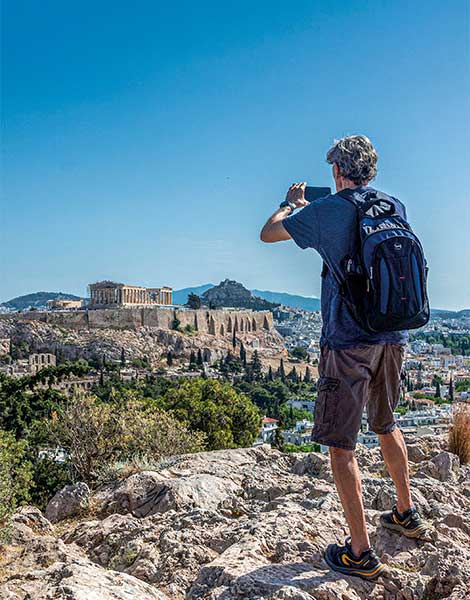 To the sounds of street musicians, we set off on a route that blends panoramic views, ancient monuments, and glimpses of authentic contemporary Athenian life. A quick right turn brings us onto the Hill of the Muses – also known as Filopappou Hill – the first stage of our journey.