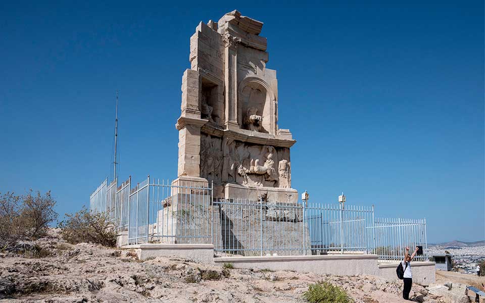 It isn’t long before we reach the top, where the grand monument built between 114 and 119 AD comes into view – a tribute to Gaius Julius Antiochus Philopappos, from whom the hill takes its modern name. The structure is made from two types of marble: one brought here in ancient times from Mt Penteli, the other from Mt Hymettus, on the city’s eastern edge.