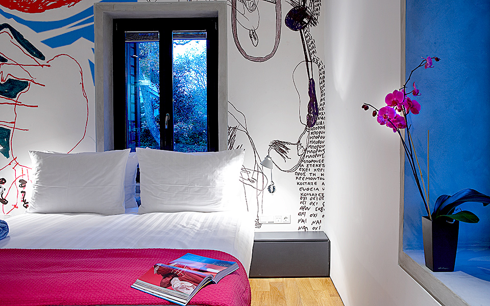 It is at number 21 of bustling Kolokotroni Street and has 21 guestrooms – hence the name – as well as a restaurant that is a destination in its own right. The feel here is one of simplicity and vitality, a sense of joie de vivre that attracts both business travelers seeking luxury and comfort, as well as others looking for a pleasant city break. Among the hotel highlights is the dominant and impressive artistic element: the modernist glass façade of the elevator and a 70-square-meter painting by Georgia Sagri, segmented off to the 21 rooms, give the hotels industrial style a touch of personality.