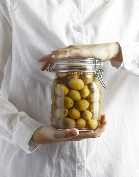 The flavor will vary depending on how they’re stored: if kept in brine, they’ll be saltier; if placed in oil and vinegar, the olives at the bottom of the jar will absorb more vinegar and develop a tangier flavor. Shake the jar occasionally to distribute the liquid evenly.