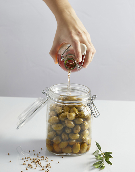 You can leave the olives in the brine or drain them and transfer them to jars, topping up with olive oil. At this stage, you may also add vinegar (about 150 ml per 2-liter jar) and aromatic herbs or spices of your choice – for example, bay leaves, peppercorns, dried chili, or coriander seeds.