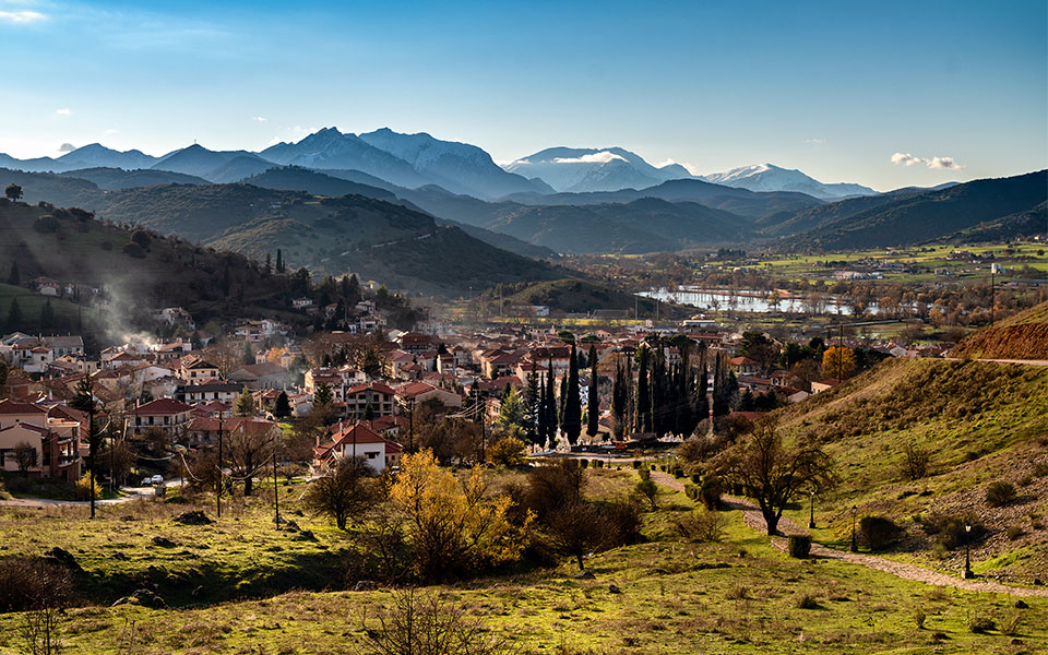 A view of Kalavryta from above. The severe weather in the area during December created a temporary lake just outside of the town.