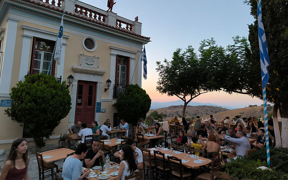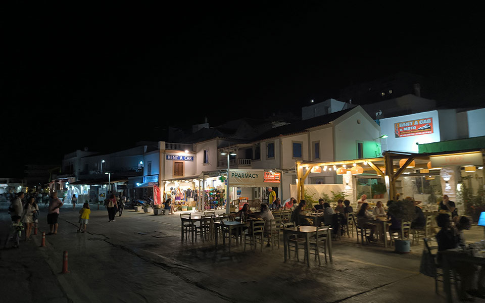 In the evening, the road in front of Korissia’s port closes to cars and becomes a pedestrian promenade.