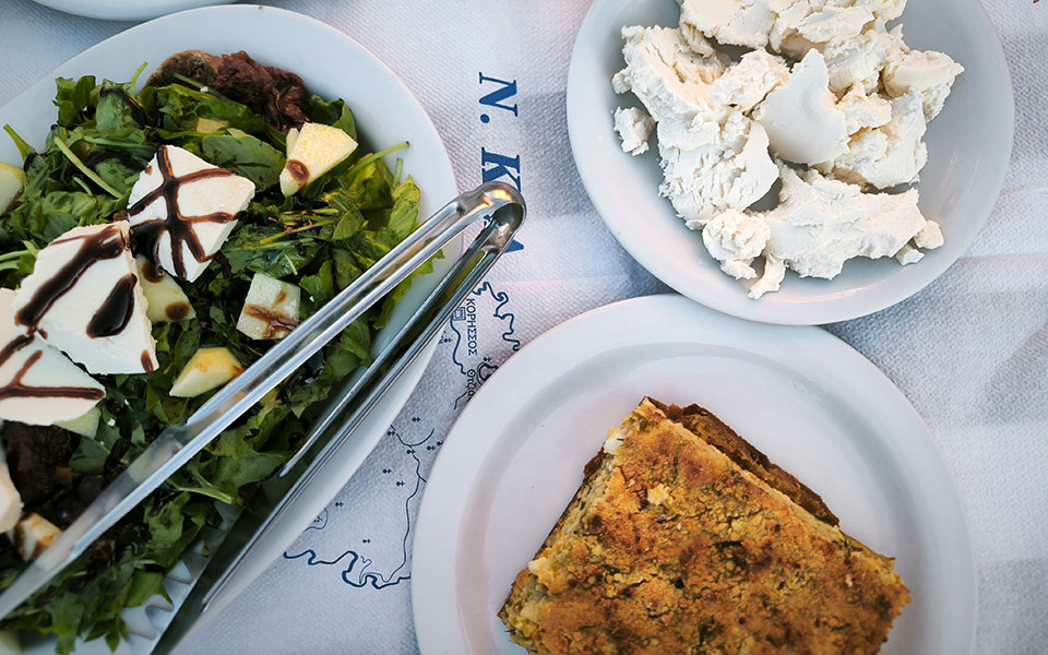 Traditional kopanisti cheese, homemade zucchini pie, and hearty salads are part of the menu at To Steki tavern.