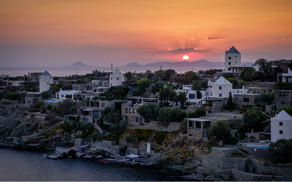 Koundouros, the island’s most cosmopolitan beach, known for its iconic windmills.
