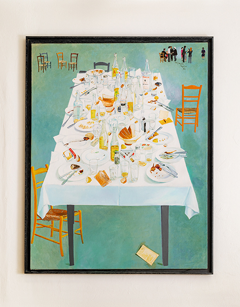 Spyros Vassiliou (1903-1985) “In the Afternoon,” 1972, acrylic and collage on canvas; this work graces a wall in Oikonomou Taverna.