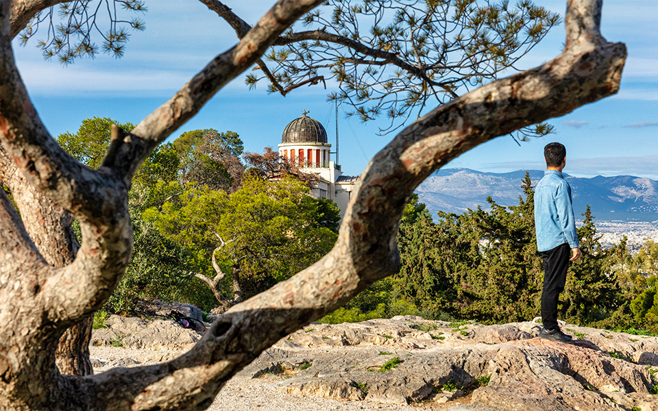 A glimpse of the National Observatory of Athens, a skyline landmark.
