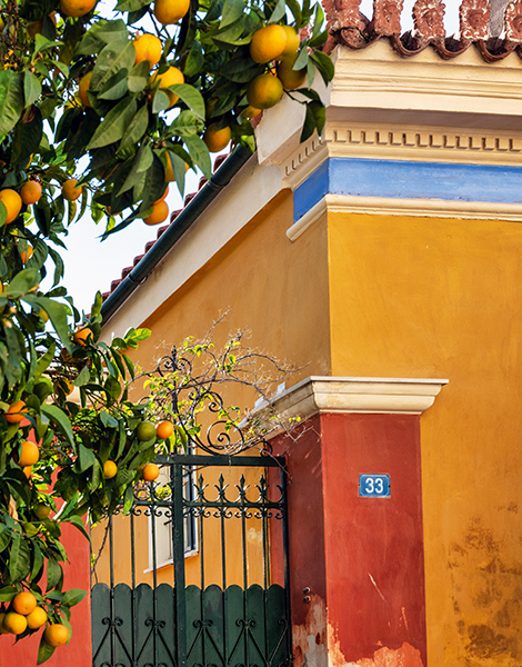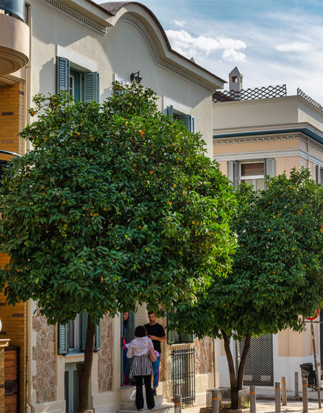 My favorite corners in Ano Petralona are virtually unknown even to architects and dedicated Athenian flâneurs. One is Agrafon Street, whose one-story homes and back gardens make it the perfect location for a movie set in 1960s Athens. On the border with Thisseio lies an even more surprising sight: a cluster of 170 honey-colored stone houses with tiled roofs, iron balconies, and lush courtyards that resemble a mountain village. Built by the charitable foundation of Queen Frederica, they housed refugees from Asia Minor who had spent decades in tin shacks in a nearby settlement that was then demolished as the project for new housing neared completion.