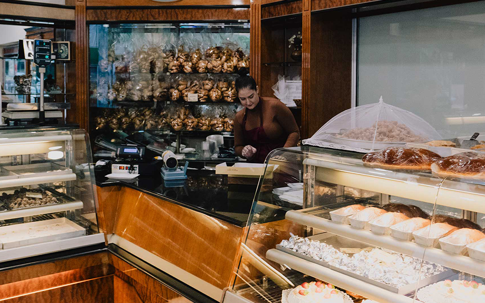 A neighborhood institution since 1967, Bozas is a pastry shop run by Xenophon Bozas, a confectioner from Constantinople. The shop has a small selection – and that’s always a good sign. In the display, you’ll find delicate wrapped cakes, dipping biscuits, tsourekia, and kourkoubinia. But the crown jewel is the almond cake: golden sponge layers filled with real whipped cream, topped with a maraschino cherry and a generous sprinkle of toasted almonds. It’s nostalgia on a plate. G.P.