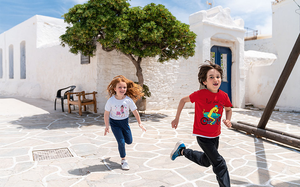 Cycladic light and color: Children enjoying the sunshine in Messaria, the Hora of Kythnos.