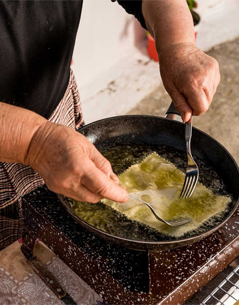 Using two forks, dip each dough sheet into the hot oil. As it fries, quickly fold and roll it with the forks to form a flute-like roll.