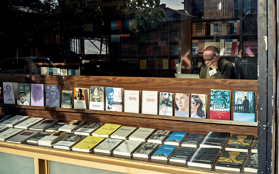 Detail from the window display of Indiktos Publications at 64 Kallidromiou Street.