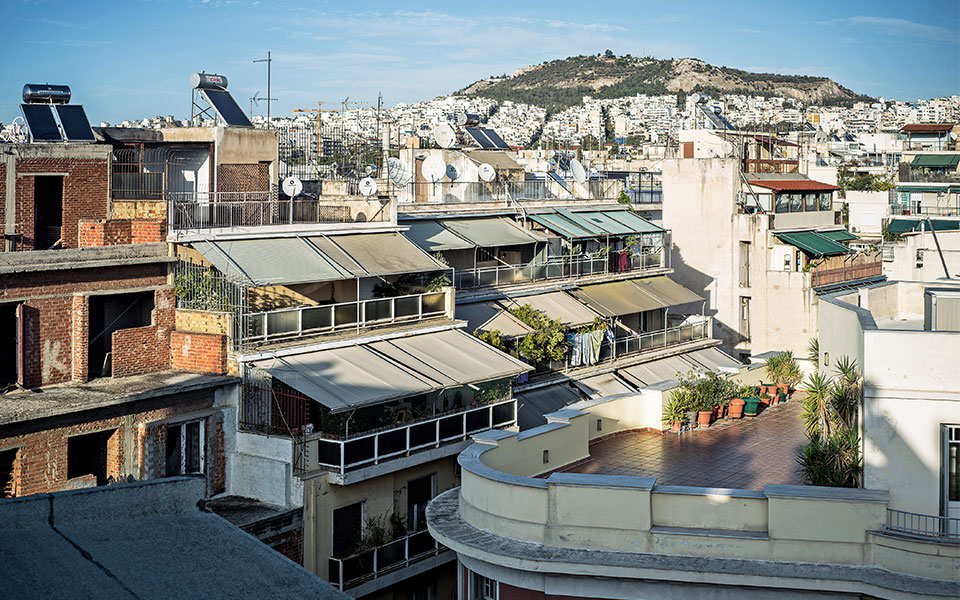 The sea of Athenian awnings and apartment buildings, as seen from a neighborhood rooftop.