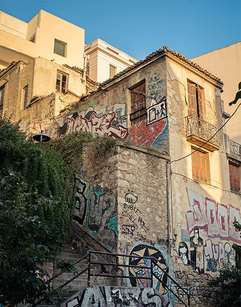 I reach Aiolos. I look for whatever remains, but instead am confronted by the scaffolding covering the neighboring buildings, which in the coming months will disappear to reveal new boutique hotels. I turn to go back and see a woman sitting on the windowsill of her apartment on Kountouriotou’s pedestrianized stretch who waves to me.
