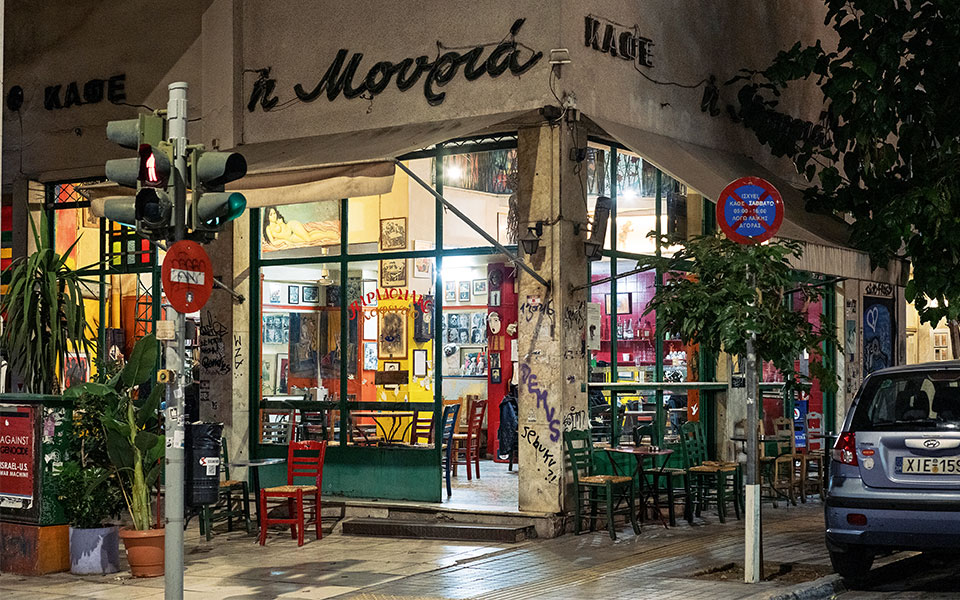 The evergreen Mouria on the corner of Harilaou Trikoupi, operating as a café-bar since 1915.