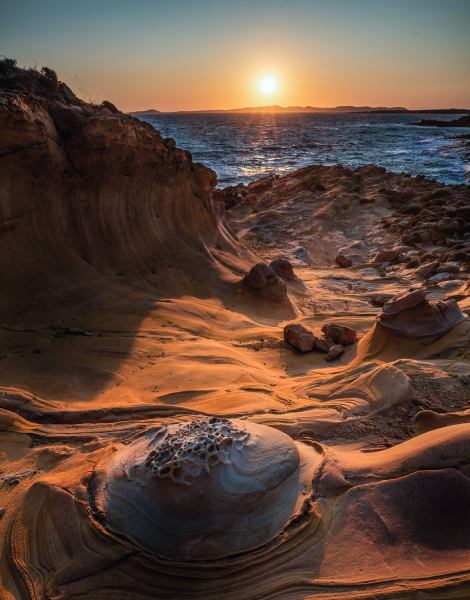 Volcanic rocks at Faraklo, a moonscape next to the sea.