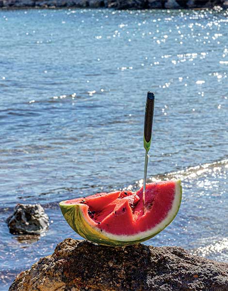 We tasted that authenticity again in the season’s first watermelon, bought from farmer Paraschos Gagas, who sells his produce near the village of Livadochori. Locals often buy fruit and vegetables this way, from roadside stands run by growers offering just-picked goods at honest prices. “If you had been here two months later, you would have tried vontina,” winemaker Manolis Garalis tells us, referring to a long, sweet, heirloom melon from Limnos. “I remember it from my childhood.”