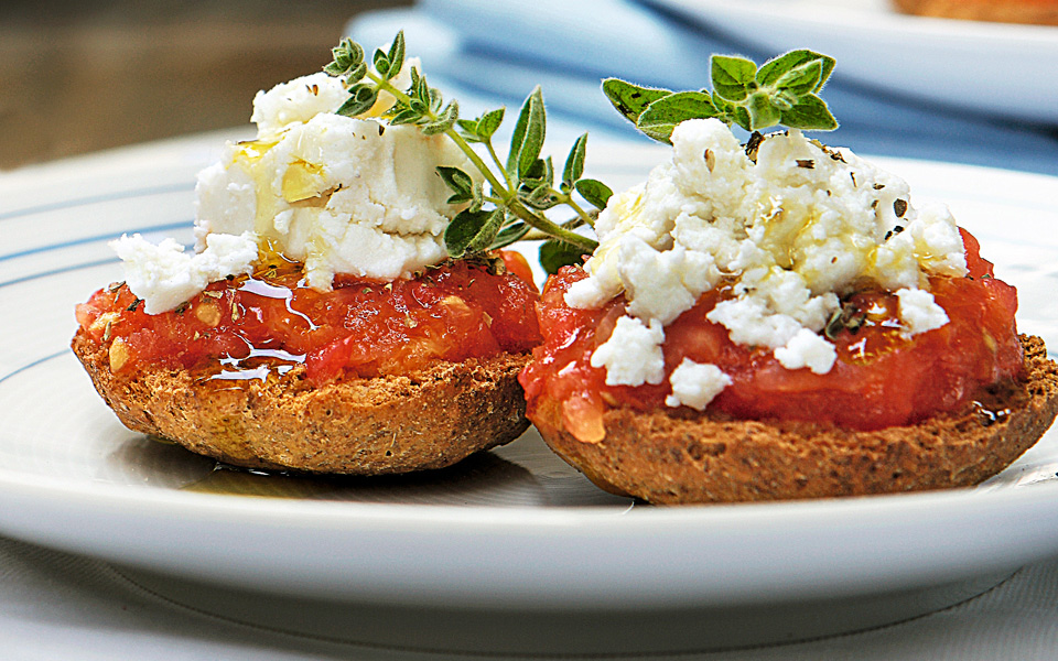 Barley rusk with fresh cheese, Santorini tomatoes and cucumber