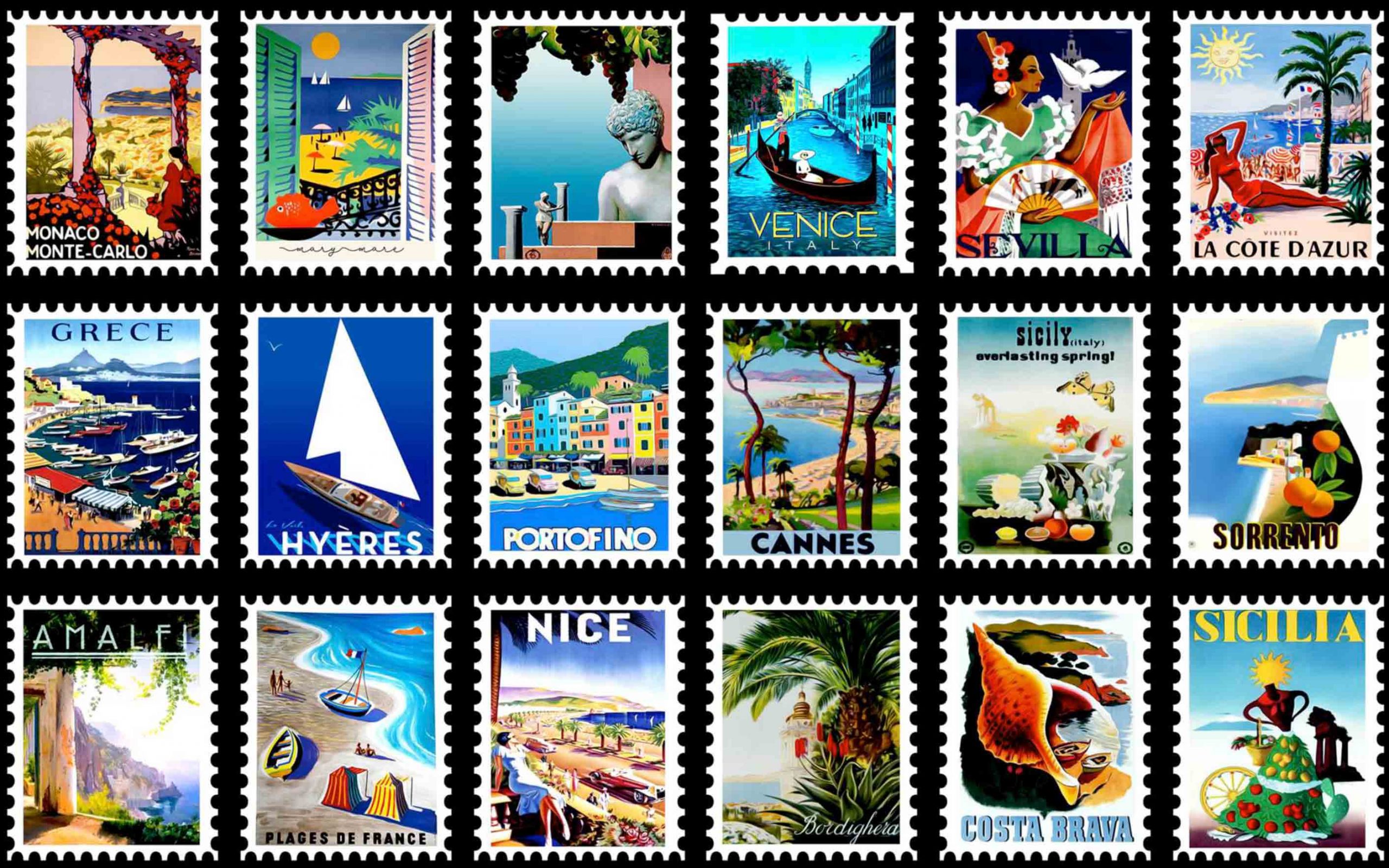 The colorful stamps depict these elegant women against backdrop of classic illustrations of 12 attractive holiday destinations including Cannes, Venice, Biarritz, and Greece.