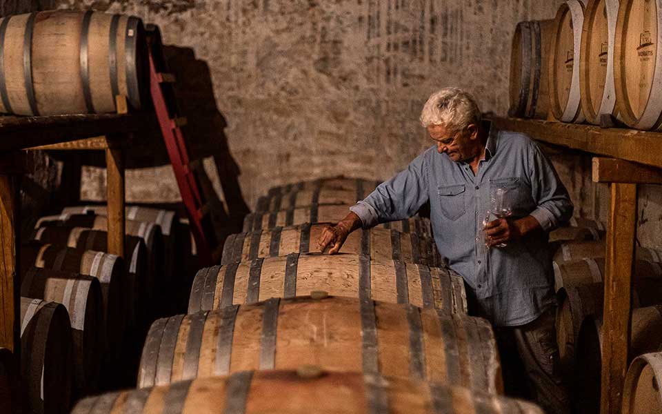 In the winery's cellar, which is the largest on the Cycladic island and consistently keeps Paros on the country's wine map.