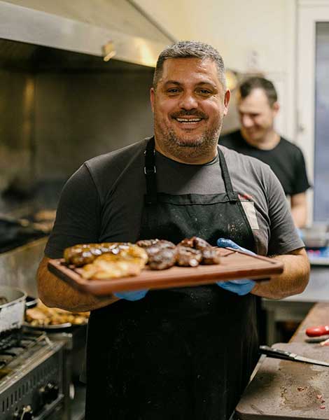 Mama Panagiota, Vasiliki’s mother, prepares the stove-top and oven-baked dishes, including lahanodolmades (stuffed cabbage rolls), the house specialty, and the delectable savory pies, showcasing her Epirus heritage. Giannis and his kitchen colleague Nikos take care of the steaks, chops and other cuts, ensuring customers enjoy traditional charcoal-grilled delights free from unnecessary frills – just pure, flavorful carnivorous fare.
