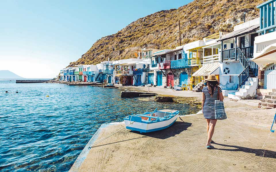 Standing on the shore at Klima, the famous fishing village with its syrmata (brightly colored boathouses) gazing out at the Bay of Milos, you’ll feel as if you are traveling by boat.