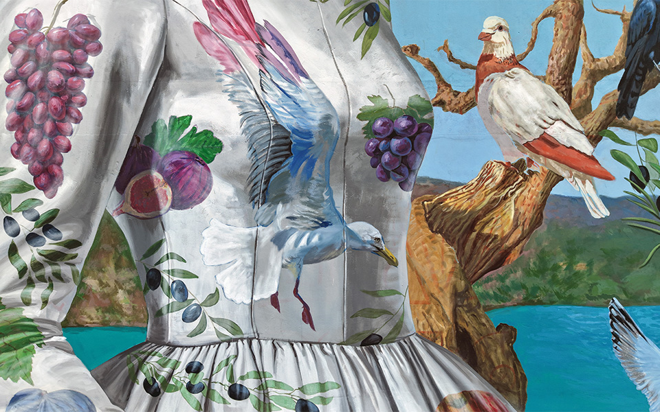 Painted on a central building façade, the mural incorporates a rich array of symbolic elements drawn from the natural and cultural landscape of Messinia. The figure’s dress is filled with references to local flora and agricultural produce, while the surrounding imagery includes birds, trees, and natural forms evoking sound, movement, and fertility. In the background, the Taygetos mountain range and a recognizable view of Kalamata’s seafront anchor the work firmly in its geographic setting.