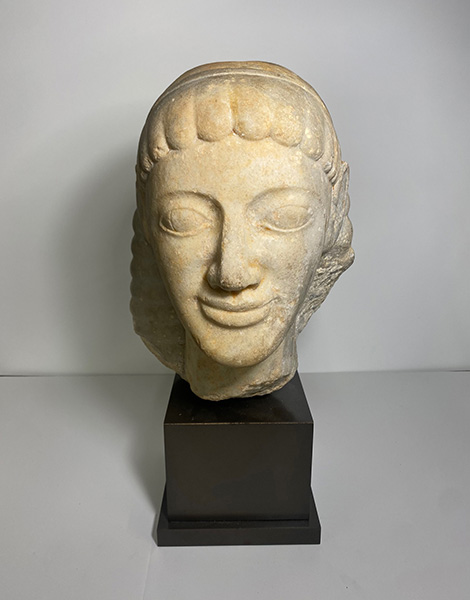 Caption: Marble head of a kouros, dating to the mid-6th century BC.