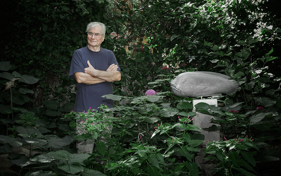 Sculptor and amateur fossil hunter, Nikos Bacharidis, seen next to one of his works in the garden of his Thessaloniki studio.