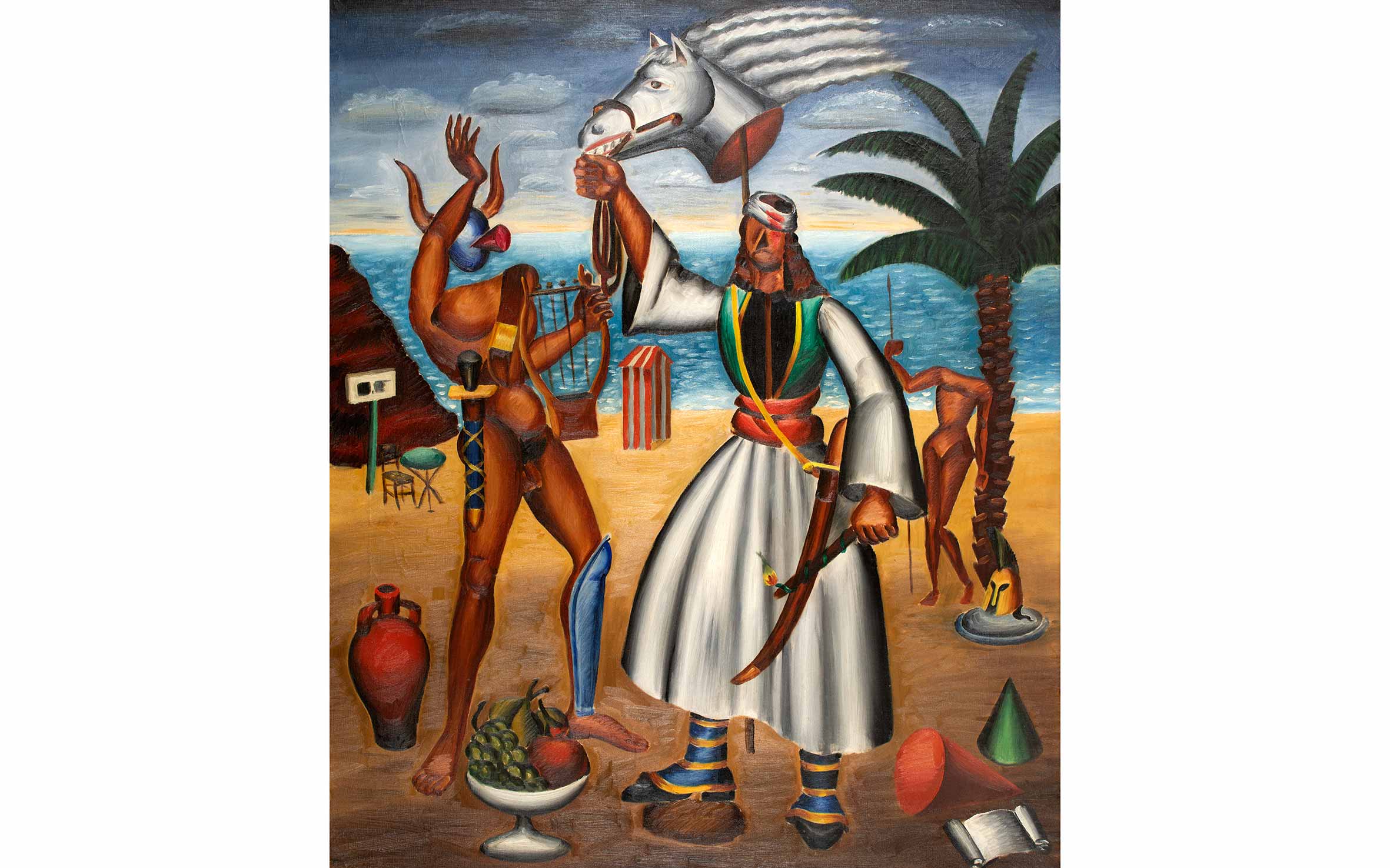 Other notable artwork for sale inspired by the Greek revolution include: Le héros Karaiskakis en guerre avec Kioutachis by Theofilos Hadjimichael (1871-1934), showing commander Georgios Karaiskakis on horseback, pursuing the Turk Reshid Mehmed Pasha, estimated at €80,000-120,000; two war hero portraits by Theofilos Hadjimichael: Le héros Odysseas Androutsos and The fearless Katsantonis, estimated at €30,000-50,000 and €22,000-28,000 respectively; and a striking work by Nikos Engonopoulos (1907-1985), inspired by the Greek revolution at the outbreak of the World War II, titled Sur la guerre d’ Indépendance / Paysage orphique, estimated at €140,000-180,000.