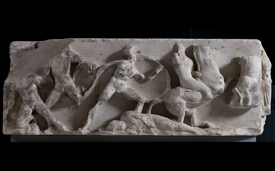 Corner block "a" of the south frieze of the Temple of Athena Nike (Ακρ. 18135) depicts Greek hoplites in pursuit of a Persian cavalryman, a scene from the battle of Marathon.