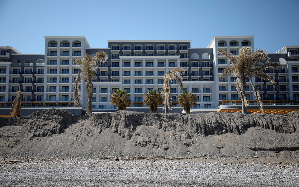 Sand hills are formed in front of a hotel at Ammoudes, Rhodes, in order to be spread on the beach at the beginning of the tourist season.