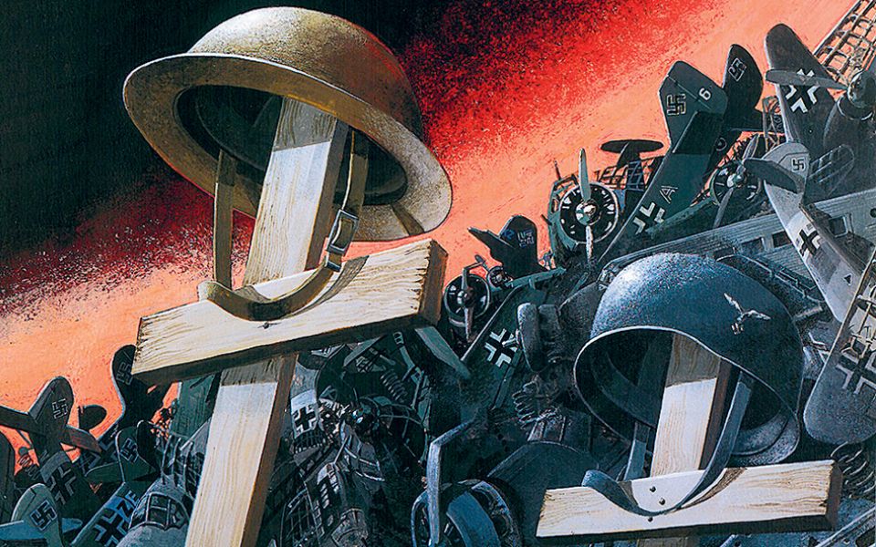 Carabott, a master of symbolism, depicted himself as a blank form with no facial or other characteristics, speaking thus of his innocence before the great brutality of the Nazis, represented as faceless metal cylinders. Thanks to a combination of luck and courage, the teenager managed to survive a war that, for him, started with the Battle of Crete, depicted in 10 iconic images. One of them shows the essence of the battle: “May 20, 1941. Iraklio, Crete. We have found refuge inside a hotel in Agios Minas. The first German paratroopers have already landed and the battle is under way. The door opens and a young Cretan girl, around 20, fully armed, calls for all men above the age of 17 to come out and fight the enemy.”