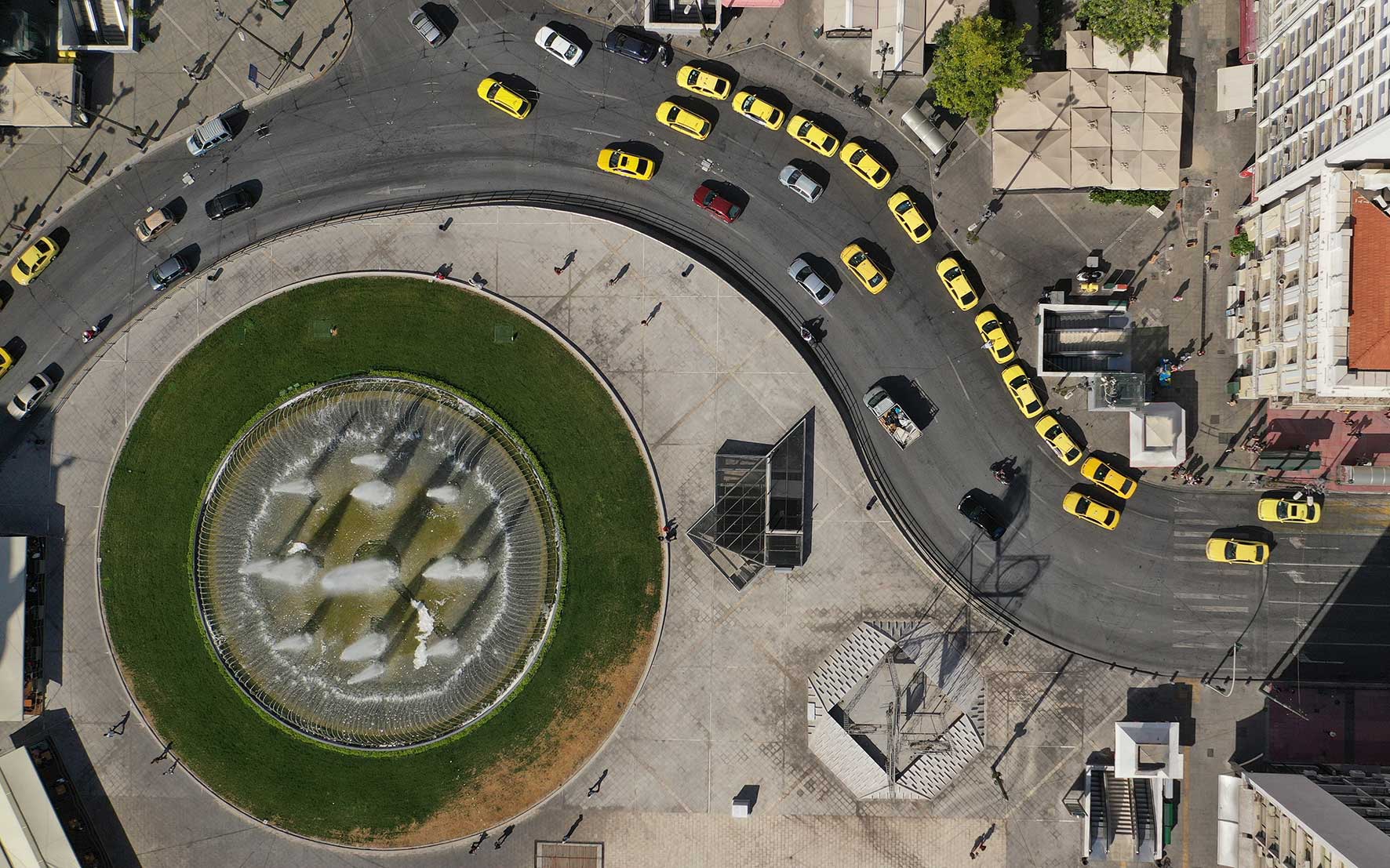 Taxis at Omonoia square in Athens, featuring its energy-efficient fountain.